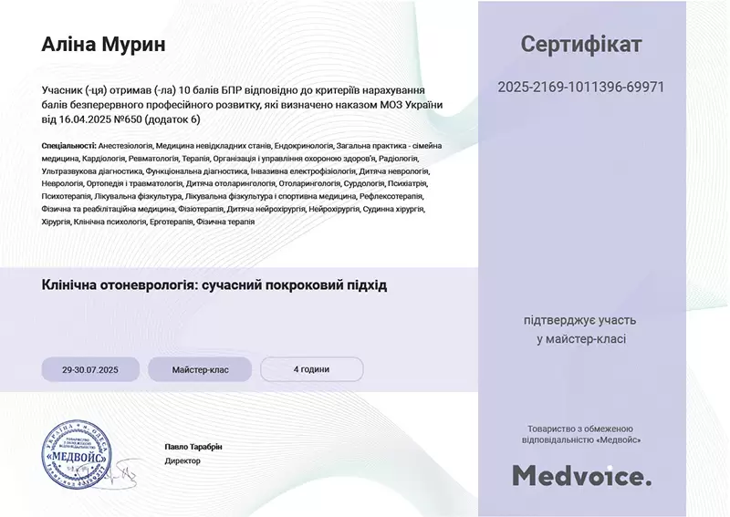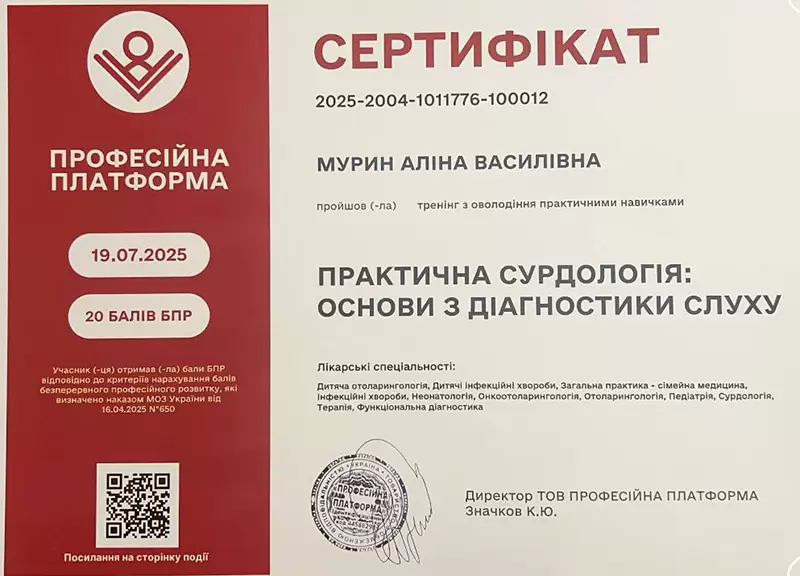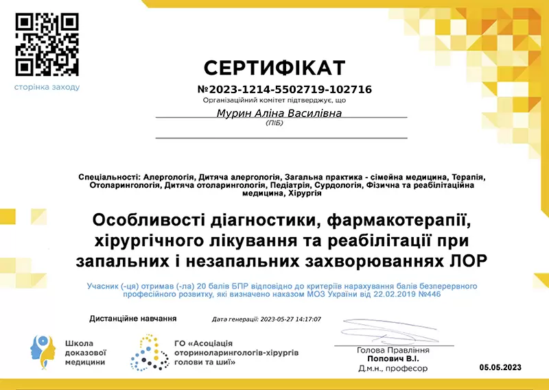 - Врач постоянно повышает квалификацию, чтобы применять современные методы диагностики и лечения ЛОР‑заболеваний.