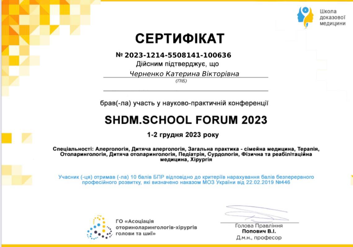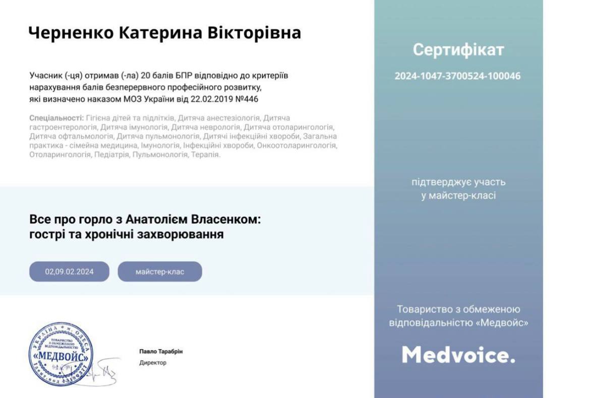 2021–2023 — Донецький національний медичний університет, спеціалізація «Дитяча отоларингологія».