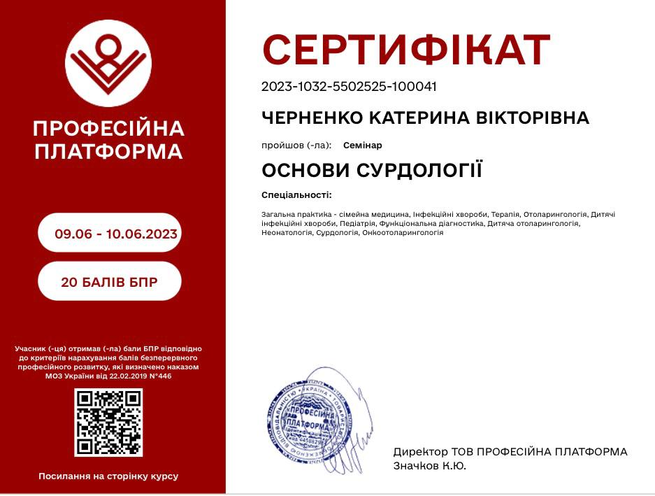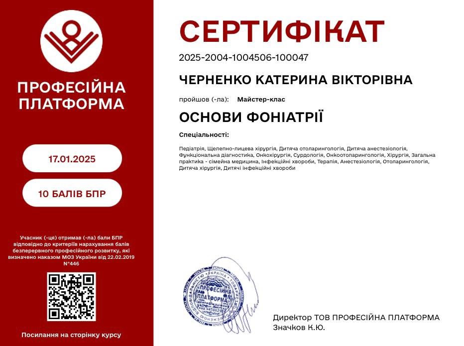 - Фокус-експертиза: гострі та хронічні ЛОР-захворювання, дитячі ЛОР-проблеми, діагностика слуху, профілактика рецидивів.