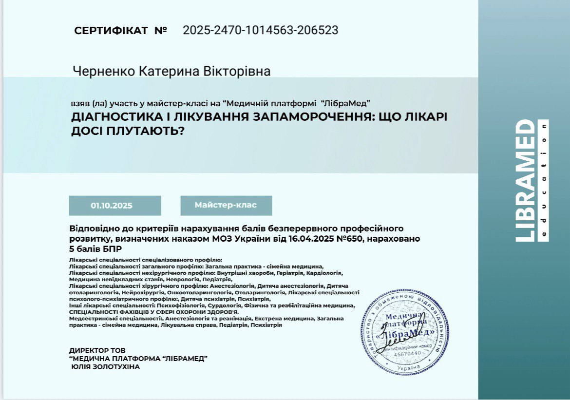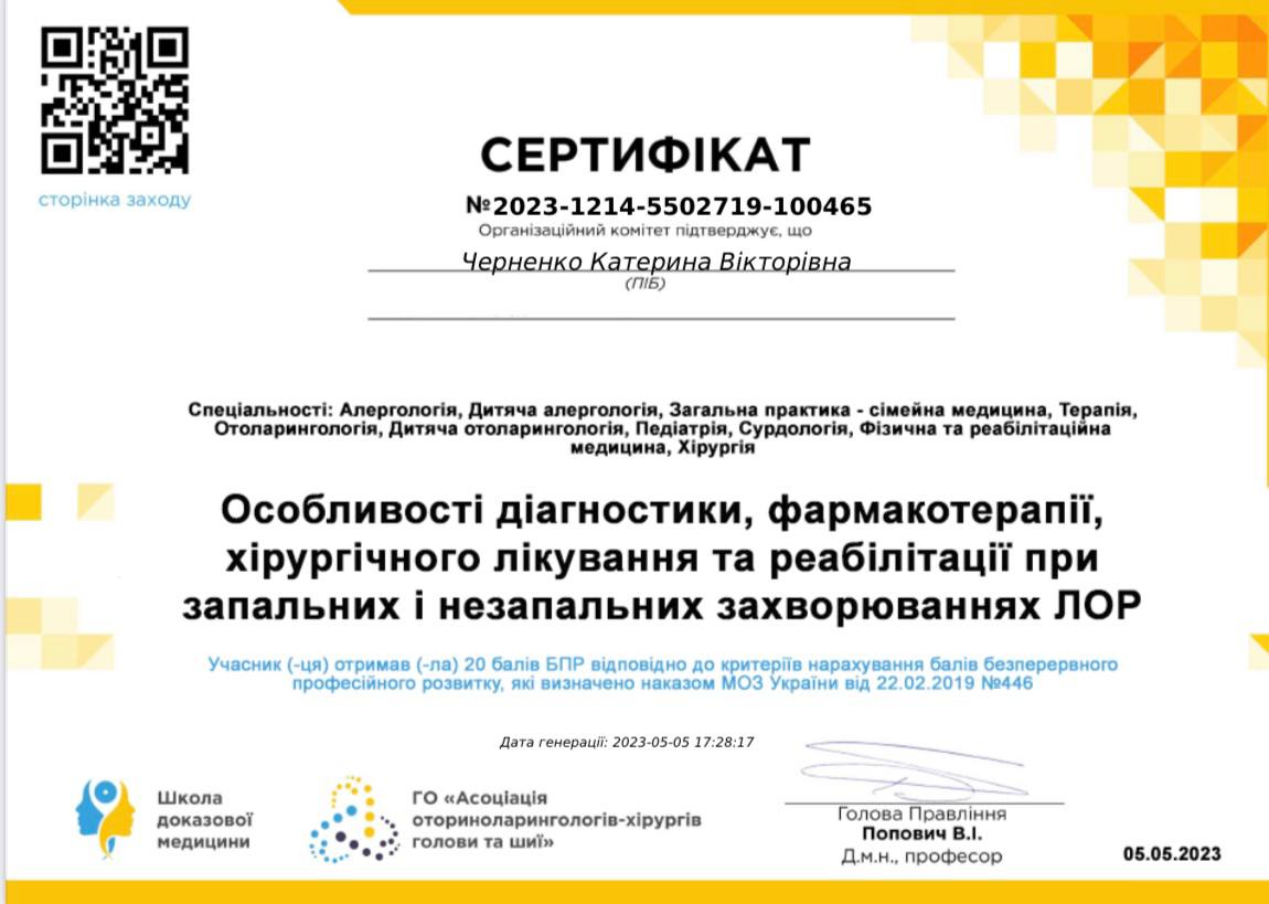 Черненко Катерина Вікторівна — ЛОР-лікар, до якої звертаються, коли затяжний нежить, біль у горлі, отити чи закладеність у вухах заважають нормально працювати, вчитися й спати. Вона поєднує класичний клінічний огляд із сучасними інструментальними методами — ендоскопією, аудіометрією, імпедансометрією, ОАЕ для дітей.