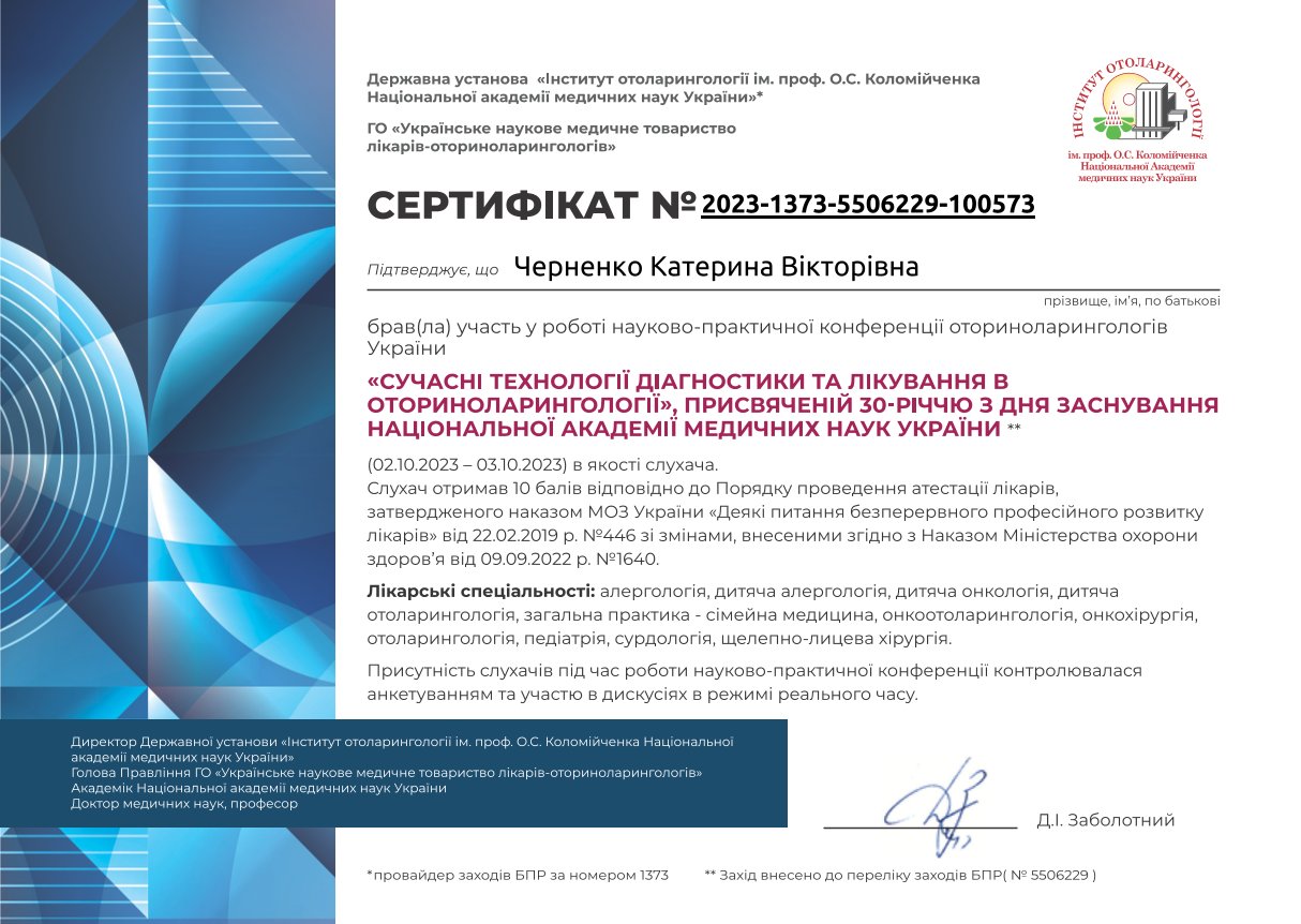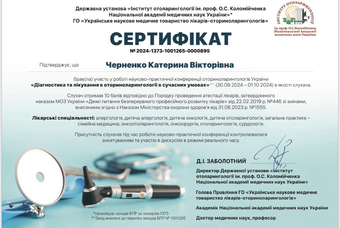Науково-практична конференції оториноларингологів України «Діагностика та лікування в оториноларингології в сучасних умовах» (30.09.2024 – 01.10.2024).