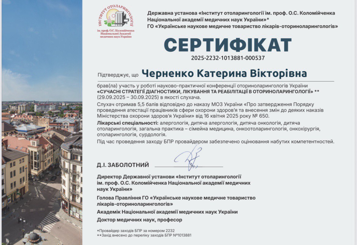 Науково-практична конференції оториноларингологів України «Сучасні стратегії діагностики, лікування та реабілітації в оториноларингології» (29.09.2025 – 30.09.2025).