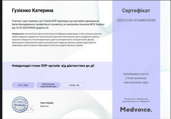 2018–2020 — Національна медична академія післядипломної освіти ім. П. Л. Шупика, спеціалізація «Оториноларингологія».