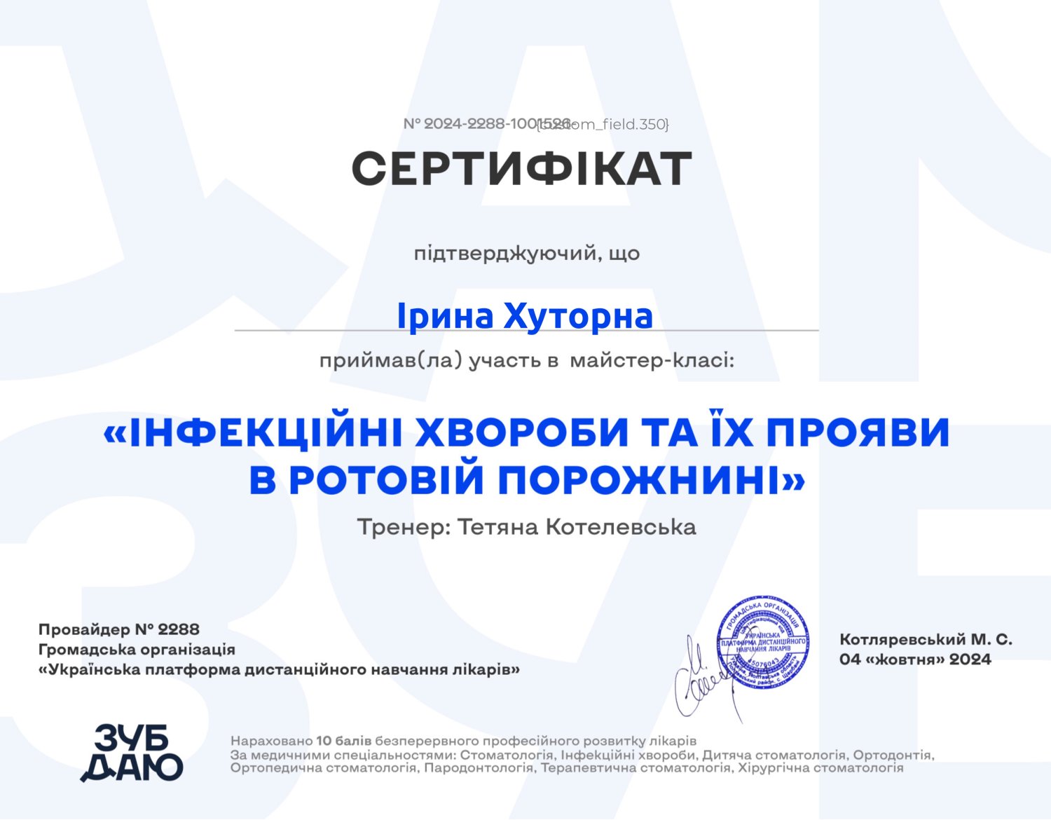 04.10.2024 ГО «Українська платформа дистанційного навчання лікарів», м. Суми Майстер-клас «Інфекційні хвороби та їх прояви в ротовій порожнині» Тренер: Тетяна Котелевська