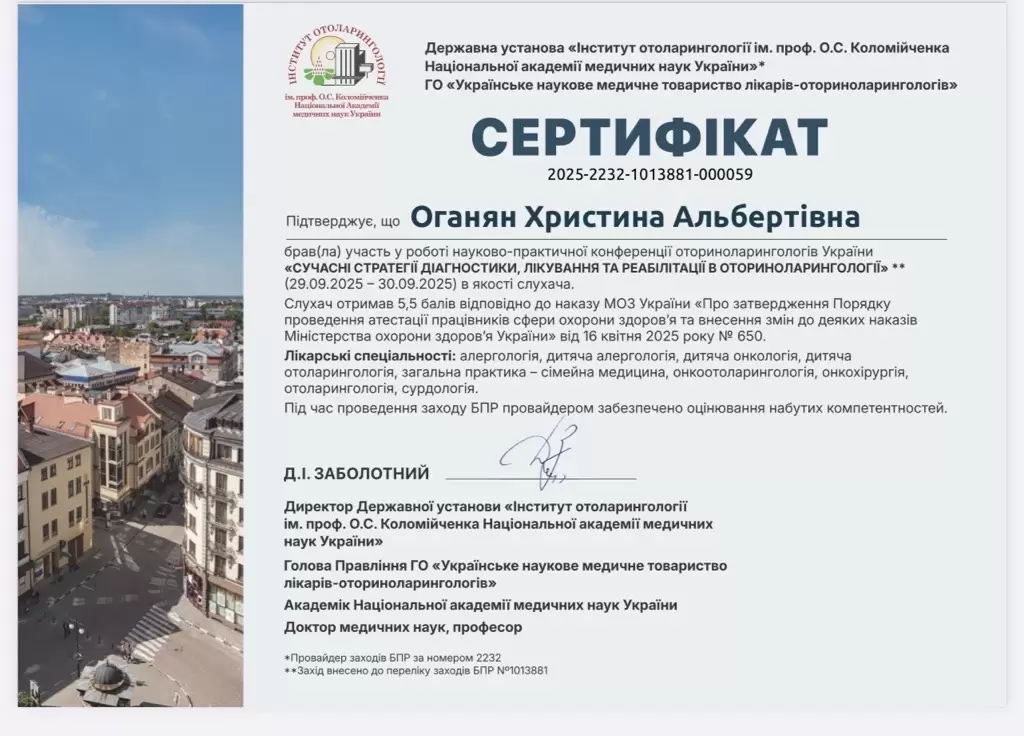 Науково-практична конференція отоларингологів України «Сучасні стратегії діагностики, лікування та реабілітації в отоларингології» (29.09.2025 – 30.09.2025, 5,5 балів БПР).