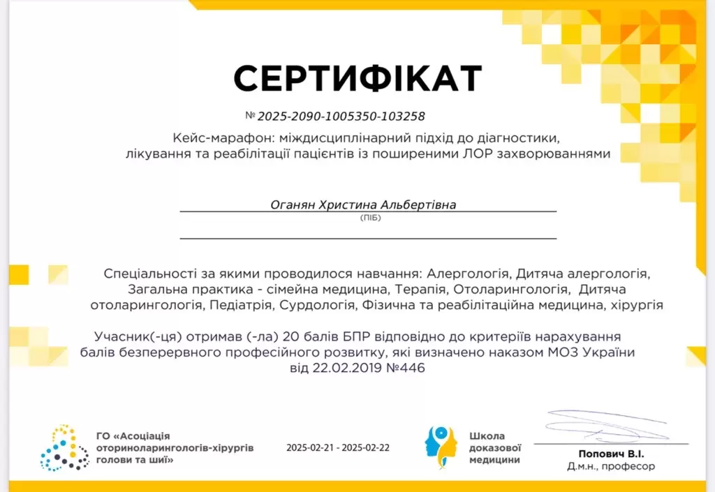Кейс-марафон: міждисциплінарний підхід до діагностики, лікування та реабілітації пацієнтів із поширеними ЛОР-захворюваннями (21–22 лютого 2025, 20 балів БПР).